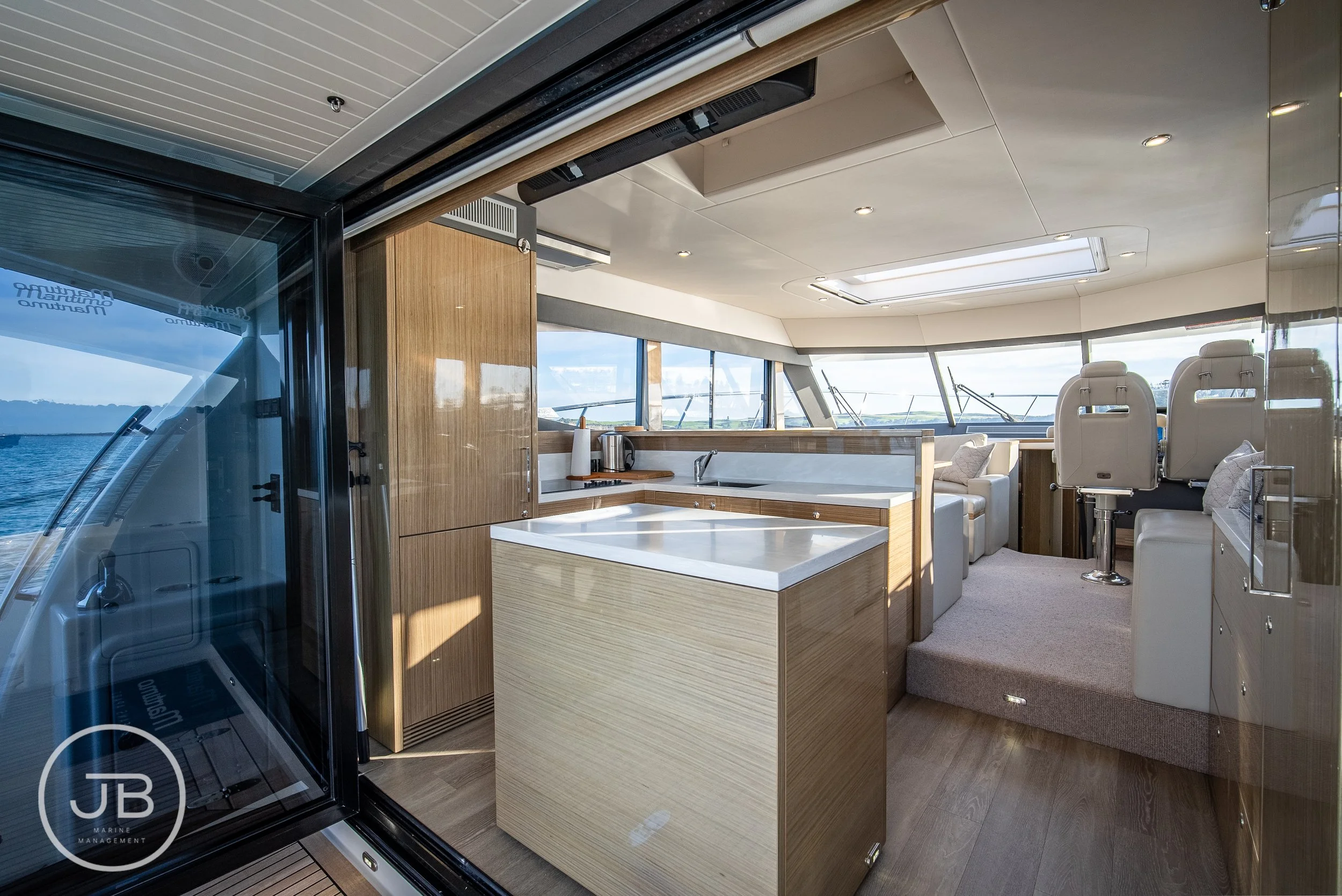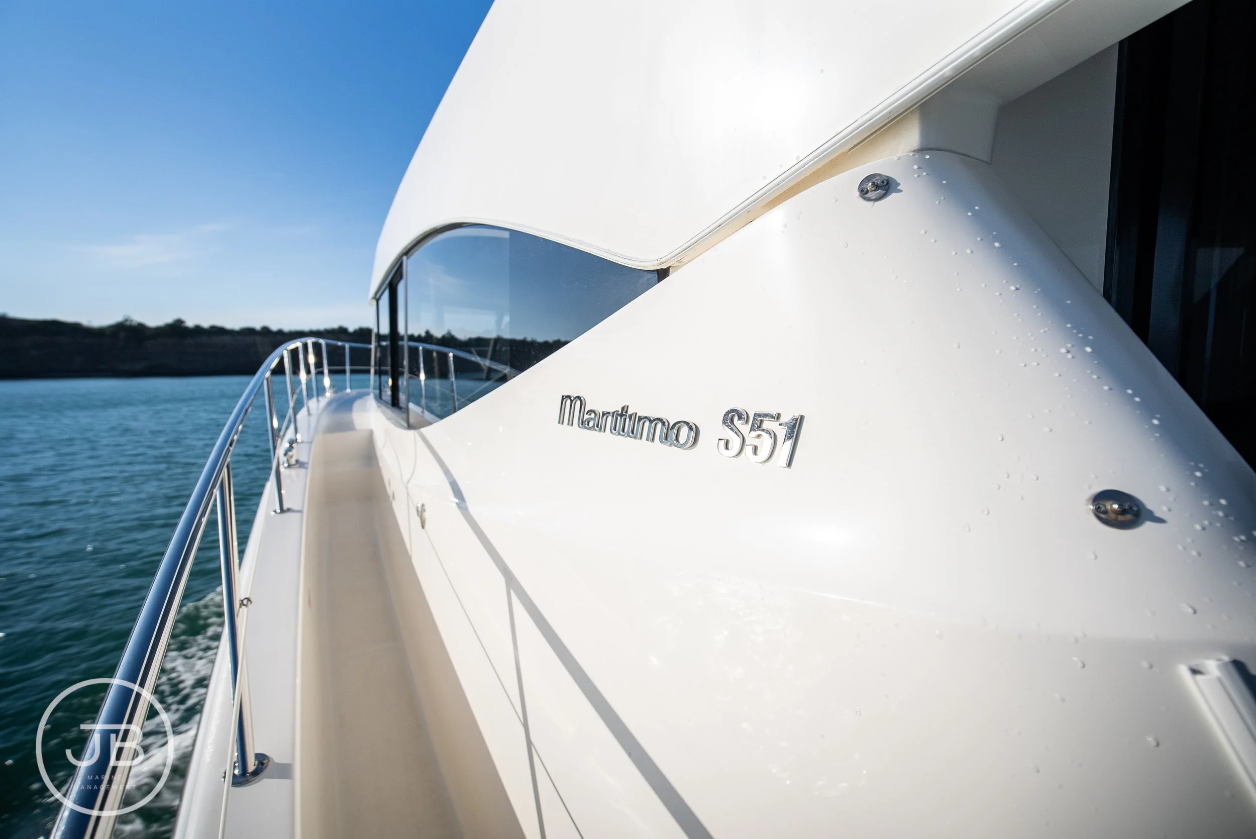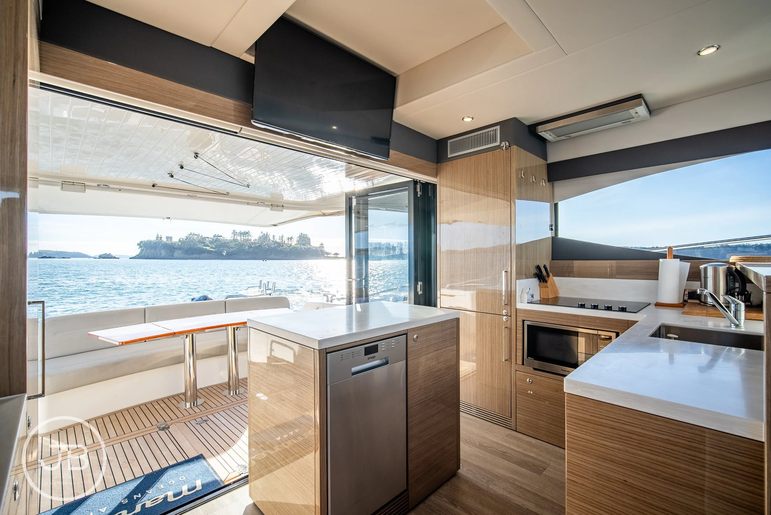 The Maritimo S51 is a sleek, single-level, sedan-style sports motor yacht. Designed with seamless entertaining in mind, she features wide walk-around decks, a spacious foredeck, and a social open-plan layout where the aft galley—equipped with a full-size fridge and pantry—connects directly to the cockpit and saloon via bi-fold doors, creating the ideal indoor-outdoor living space.