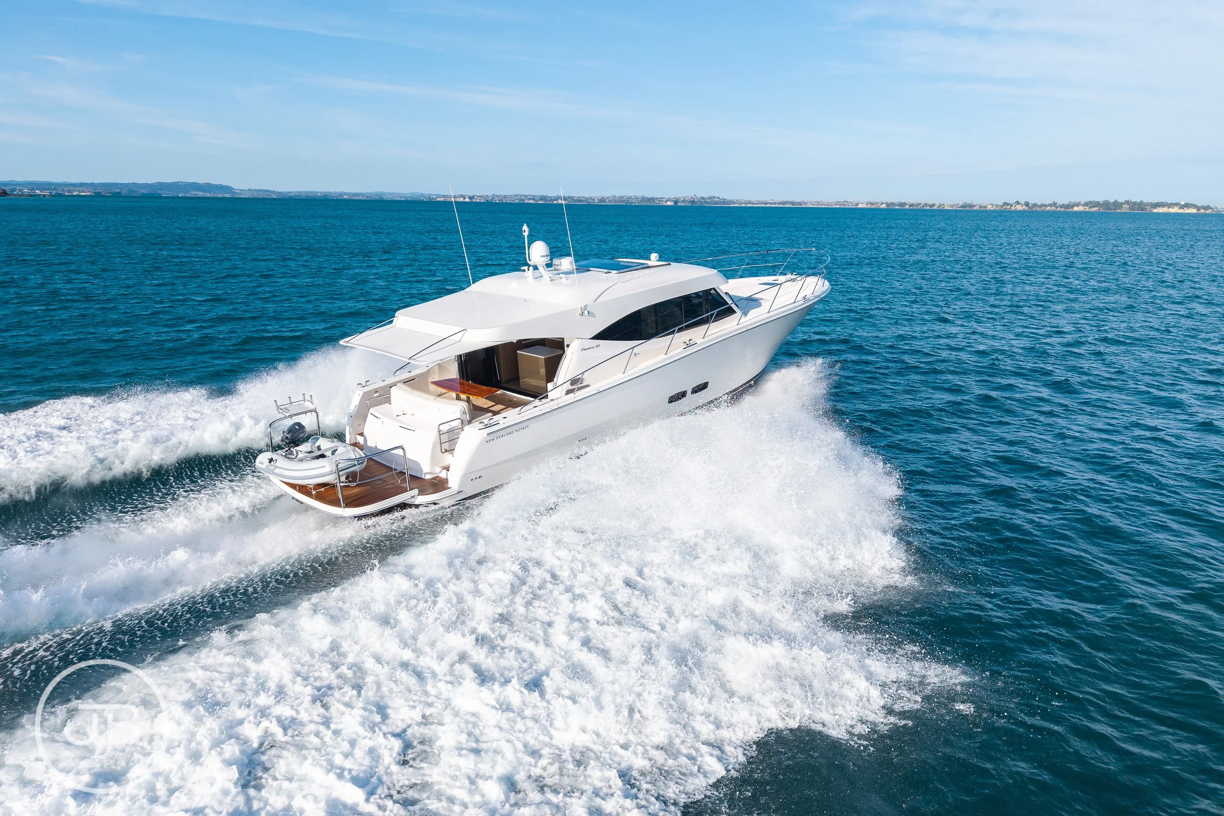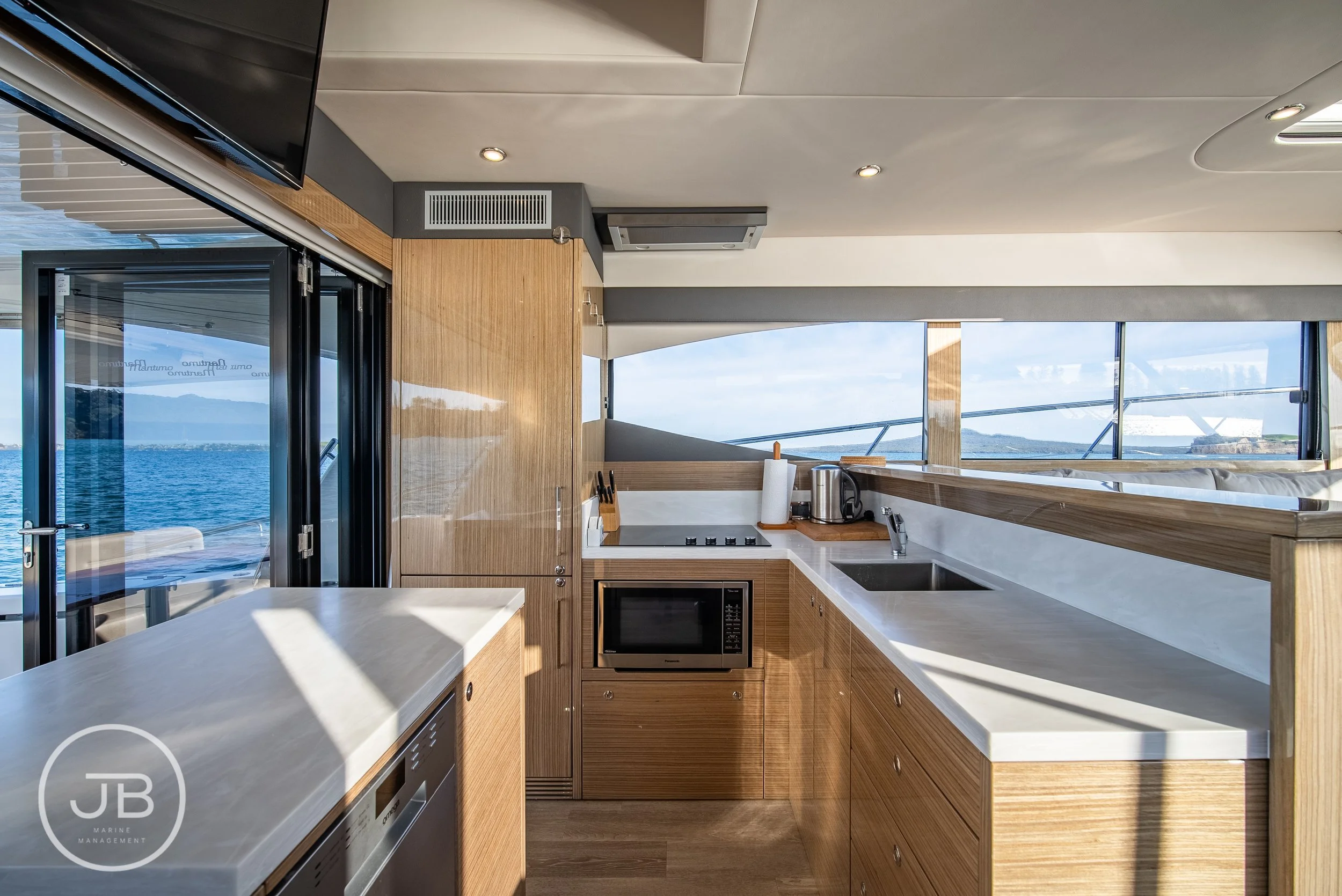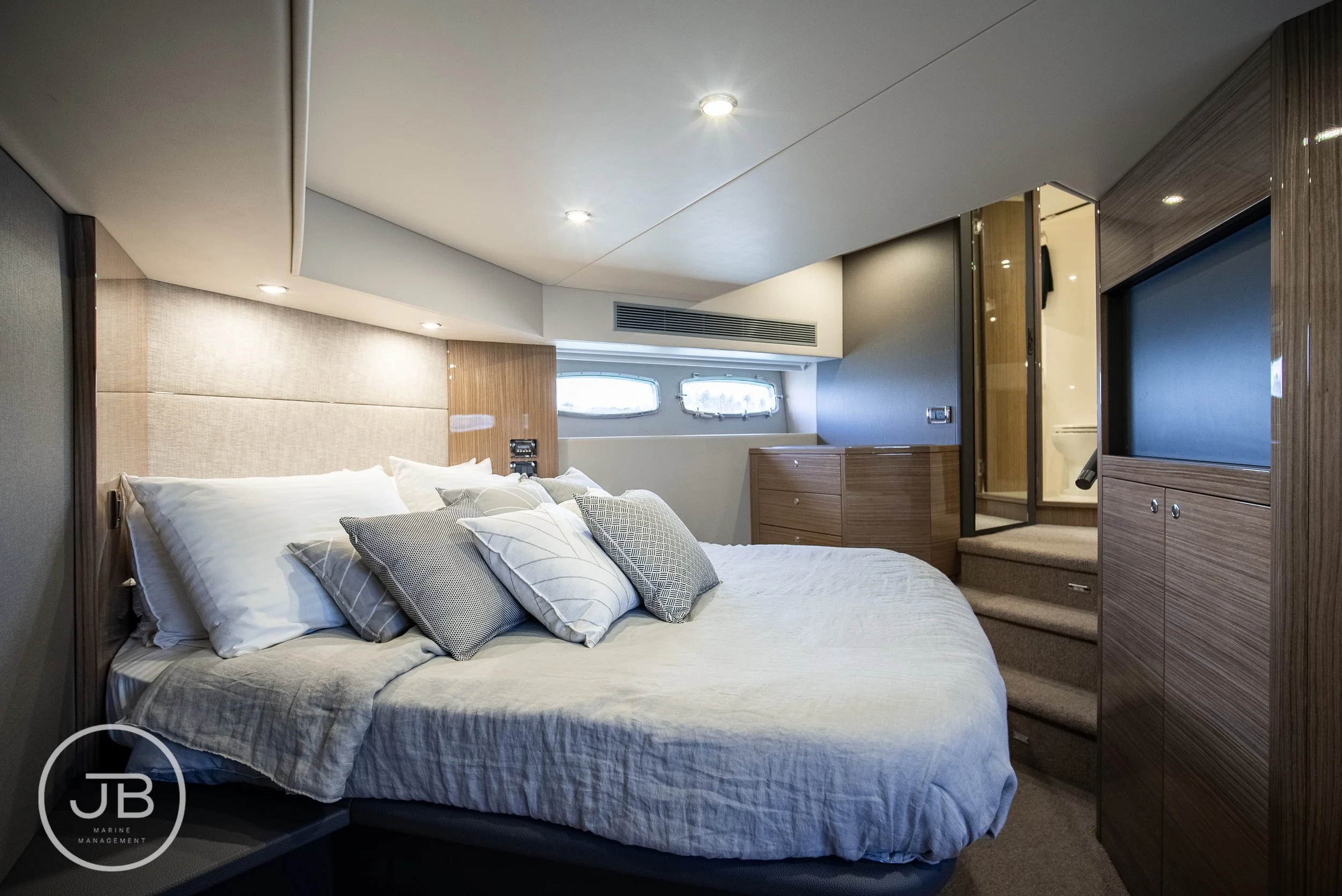The Maritimo S51 is a sleek, single-level, sedan-style sports motor yacht. Designed with seamless entertaining in mind, she features wide walk-around decks, a spacious foredeck, and a social open-plan layout where the aft galley—equipped with a full-size fridge and pantry—connects directly to the cockpit and saloon via bi-fold doors, creating the ideal indoor-outdoor living space.