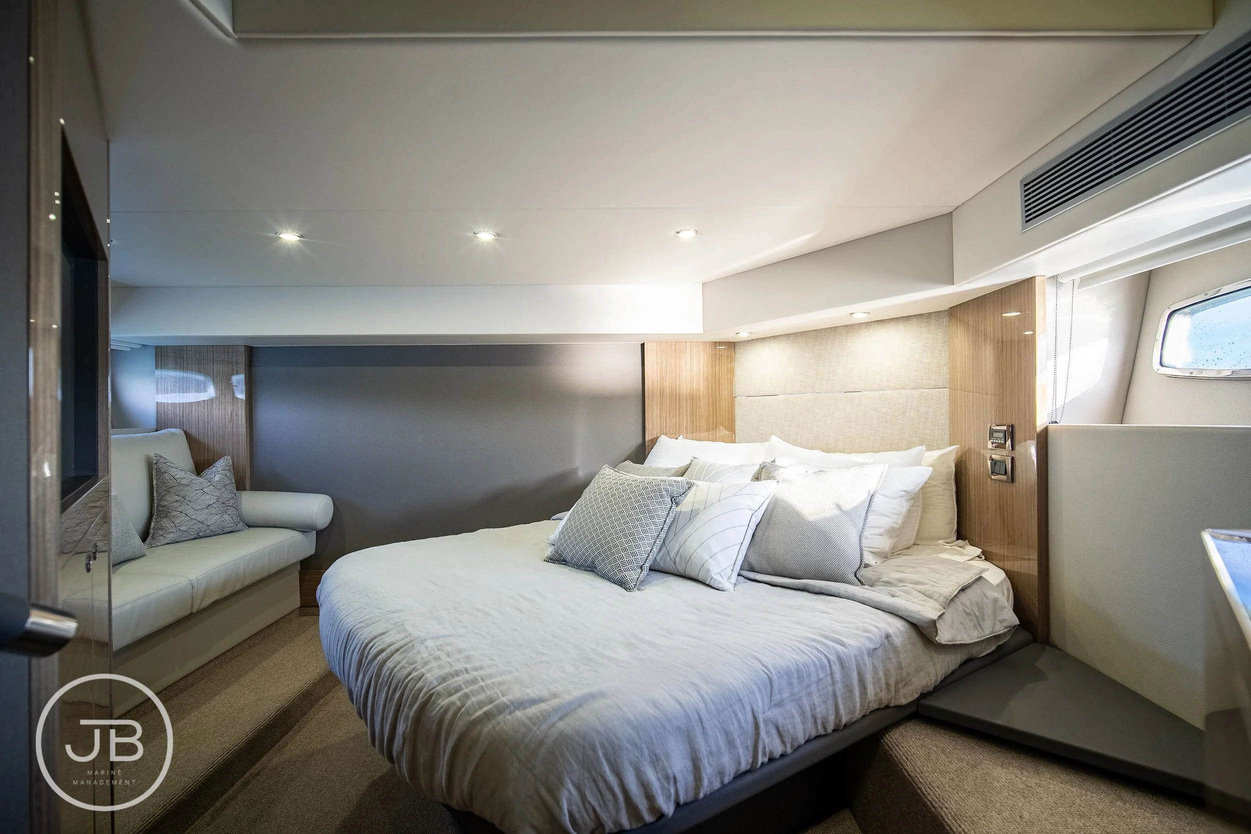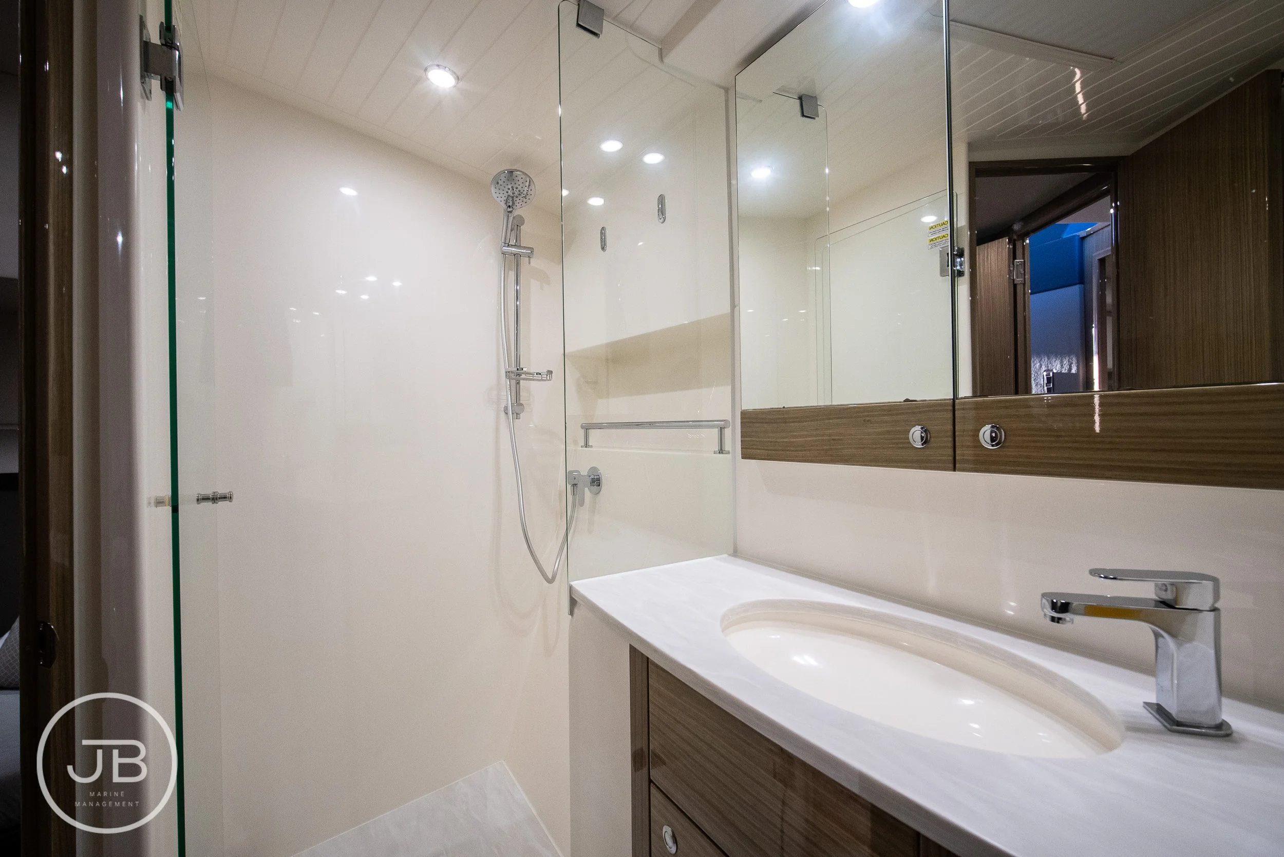 Below deck, she comfortably accommodates up to five guests across three well-appointed cabins, anchored by a luxurious full-beam master suite with a king-sized bed, private en-suite, and chaise lounge—a standout feature in this class.