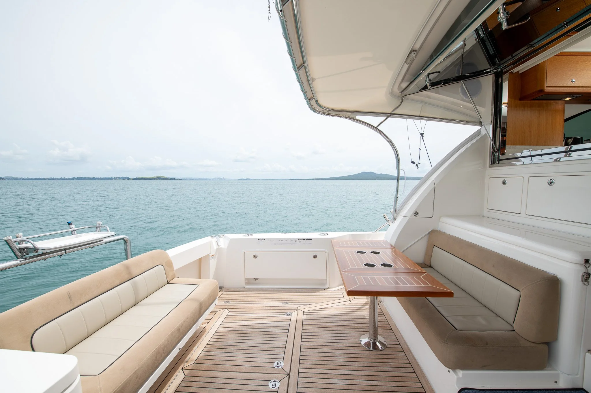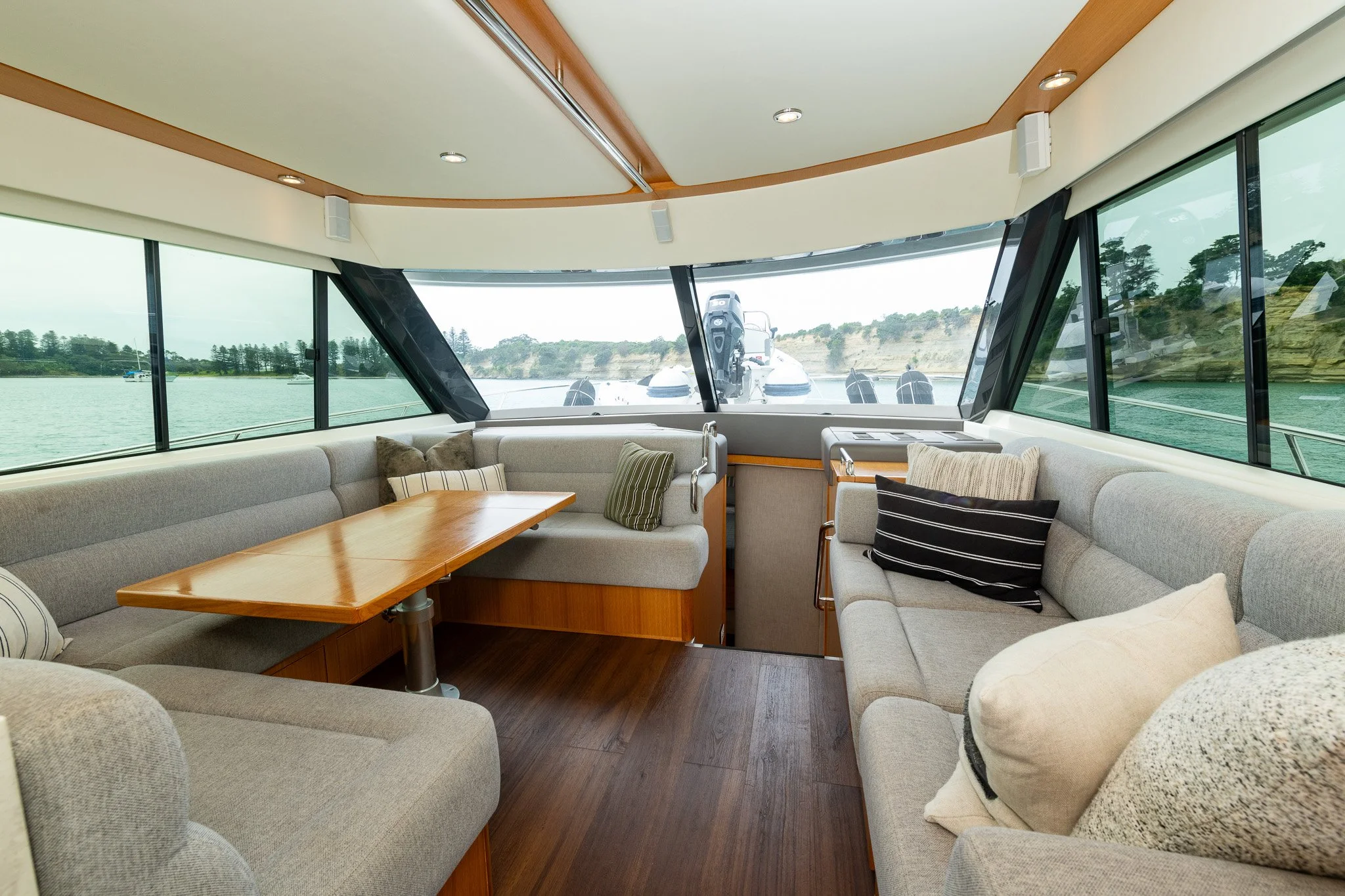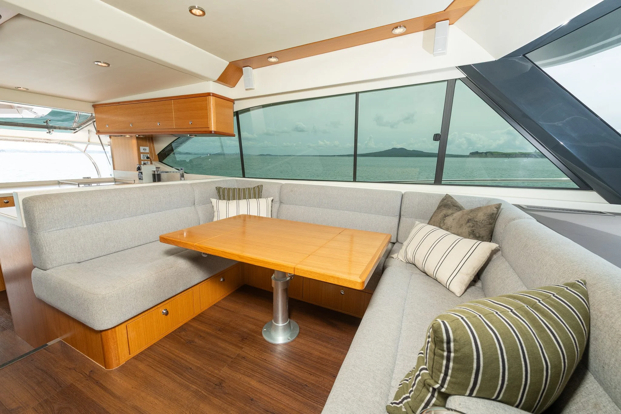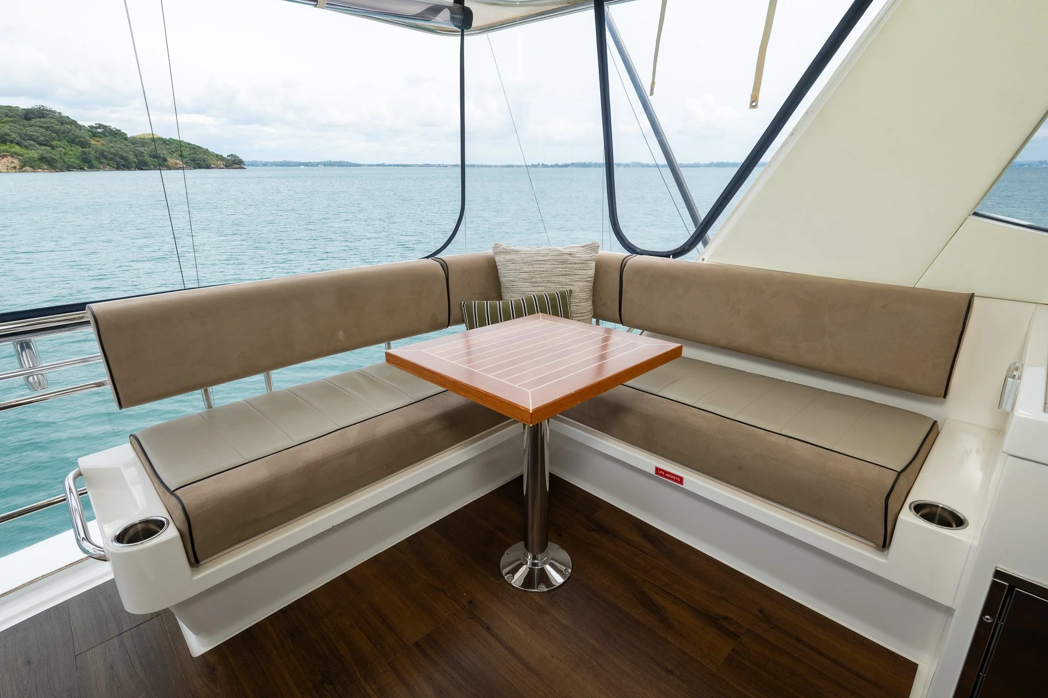 The IPS system ensures confident handling, impressive fuel economy and quiet performance, making her equally suited to experienced owners or family cruising. The enclosed flybridge creates a true second living space with panoramic visibility and a premium helm equipped with Garmin electronics and helm plus four driving station toggles for complete operational control. New flybridge and cockpit upholstery present in excellent condition, while LED mood lighting throughout enhances the atmosphere for evening entertaining. The cockpit is exceptionally well appointed with new refrigeration, generous mezzanine seating and a new rear awning providing additional shade and protection, creating a superb space for relaxing at anchor or hosting guests.