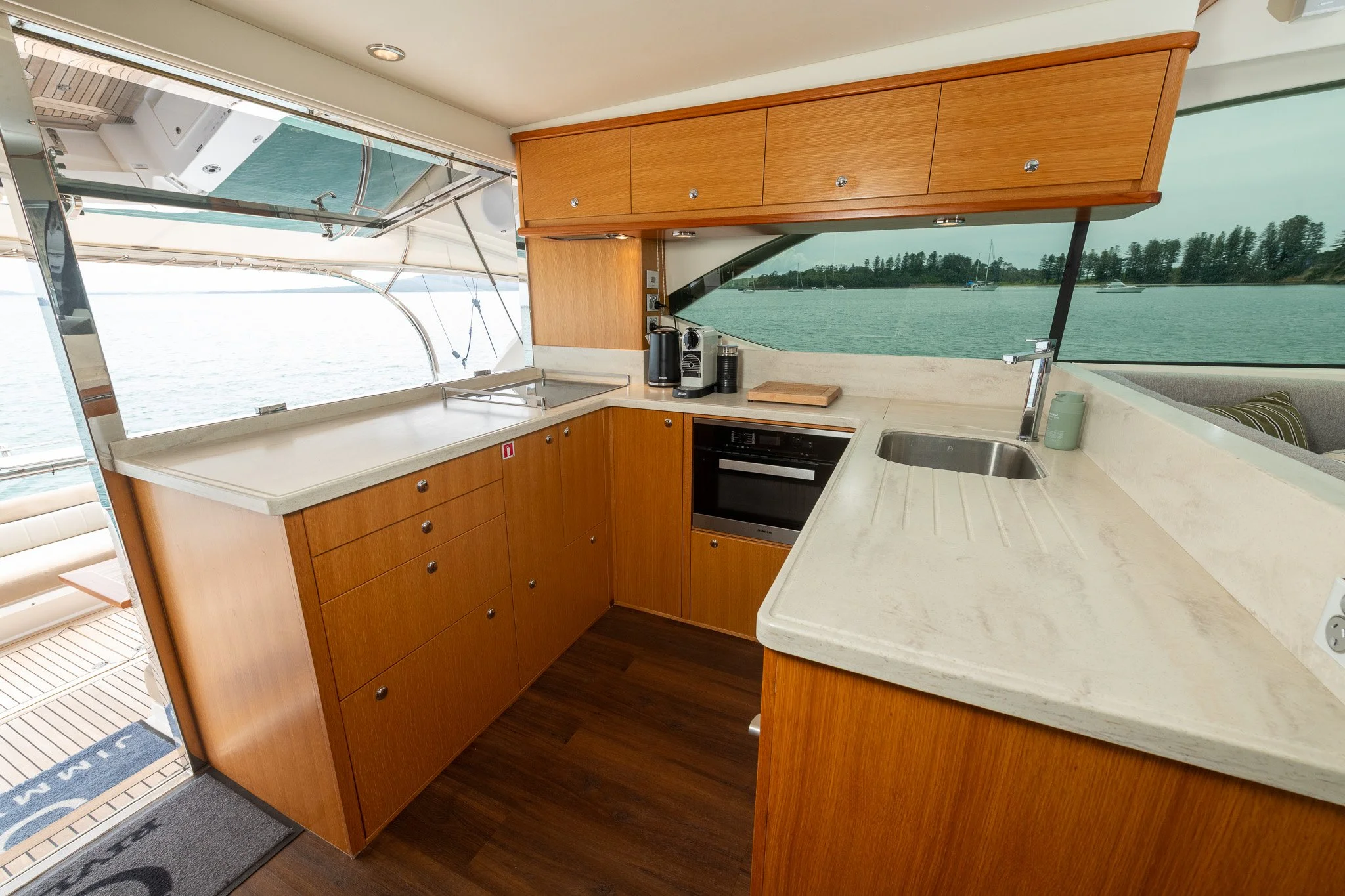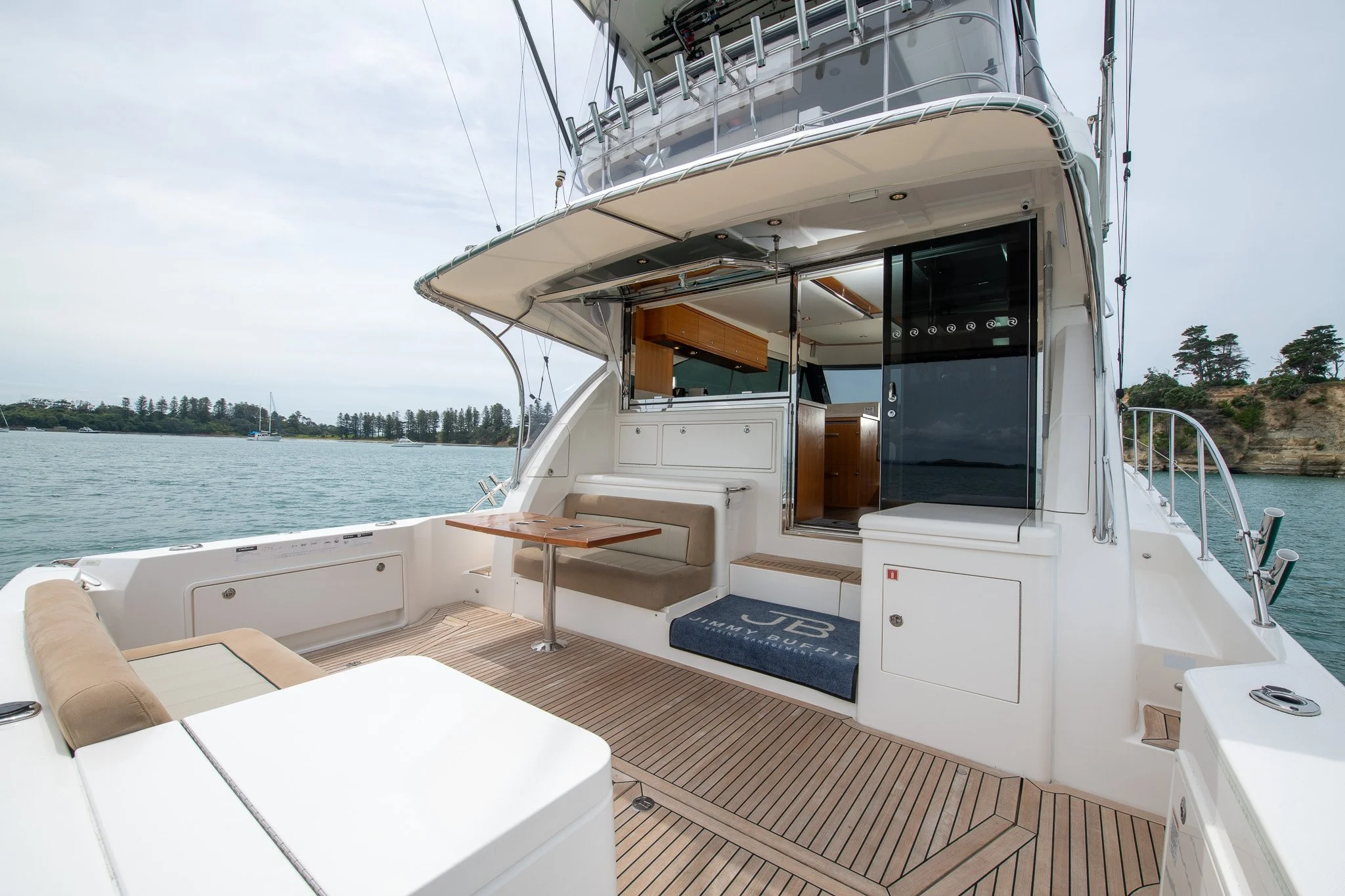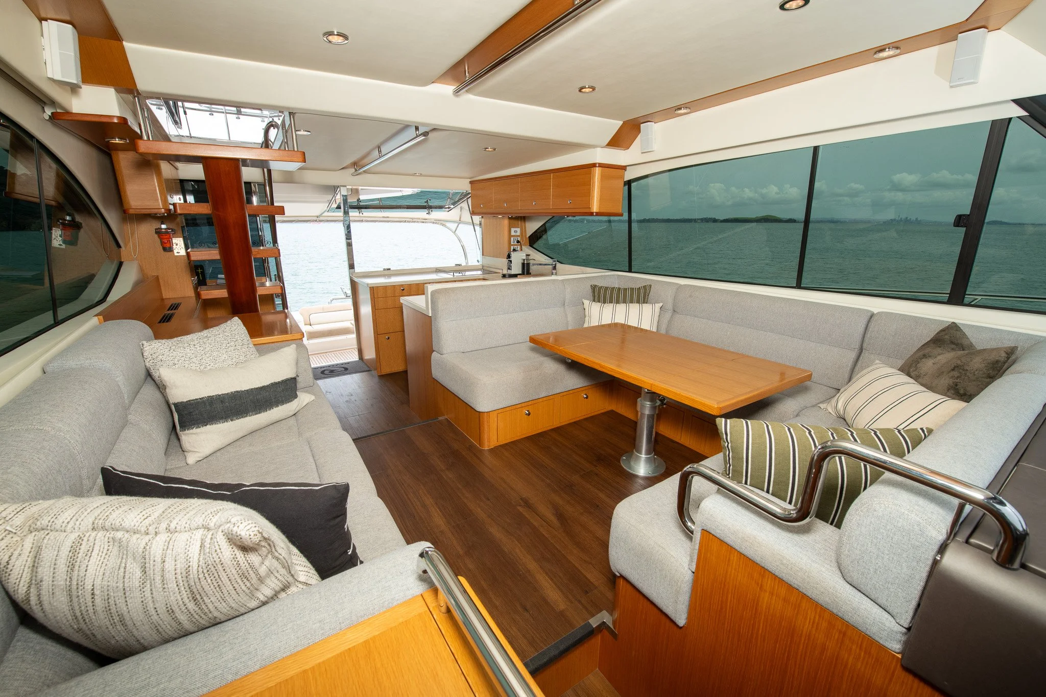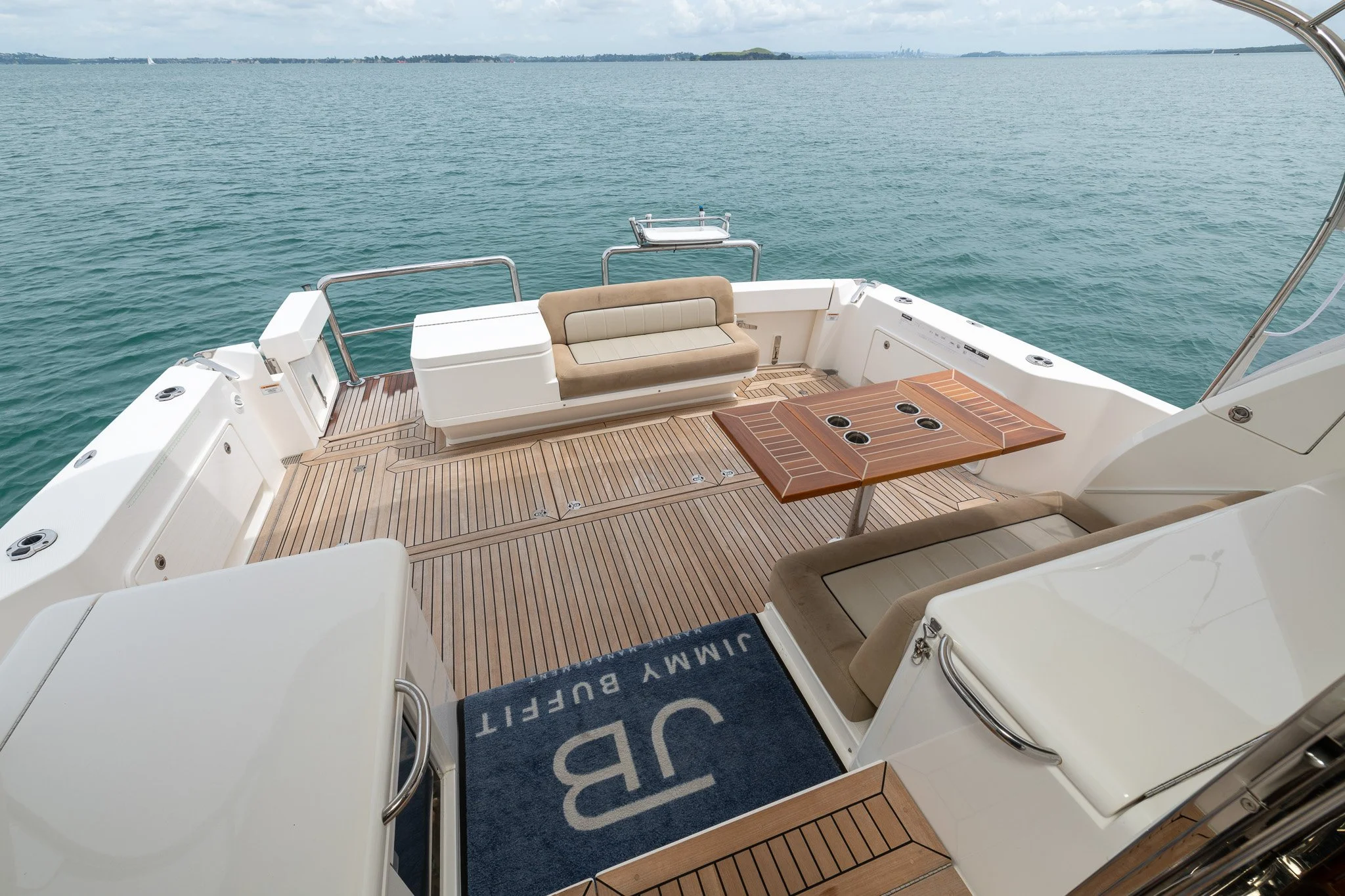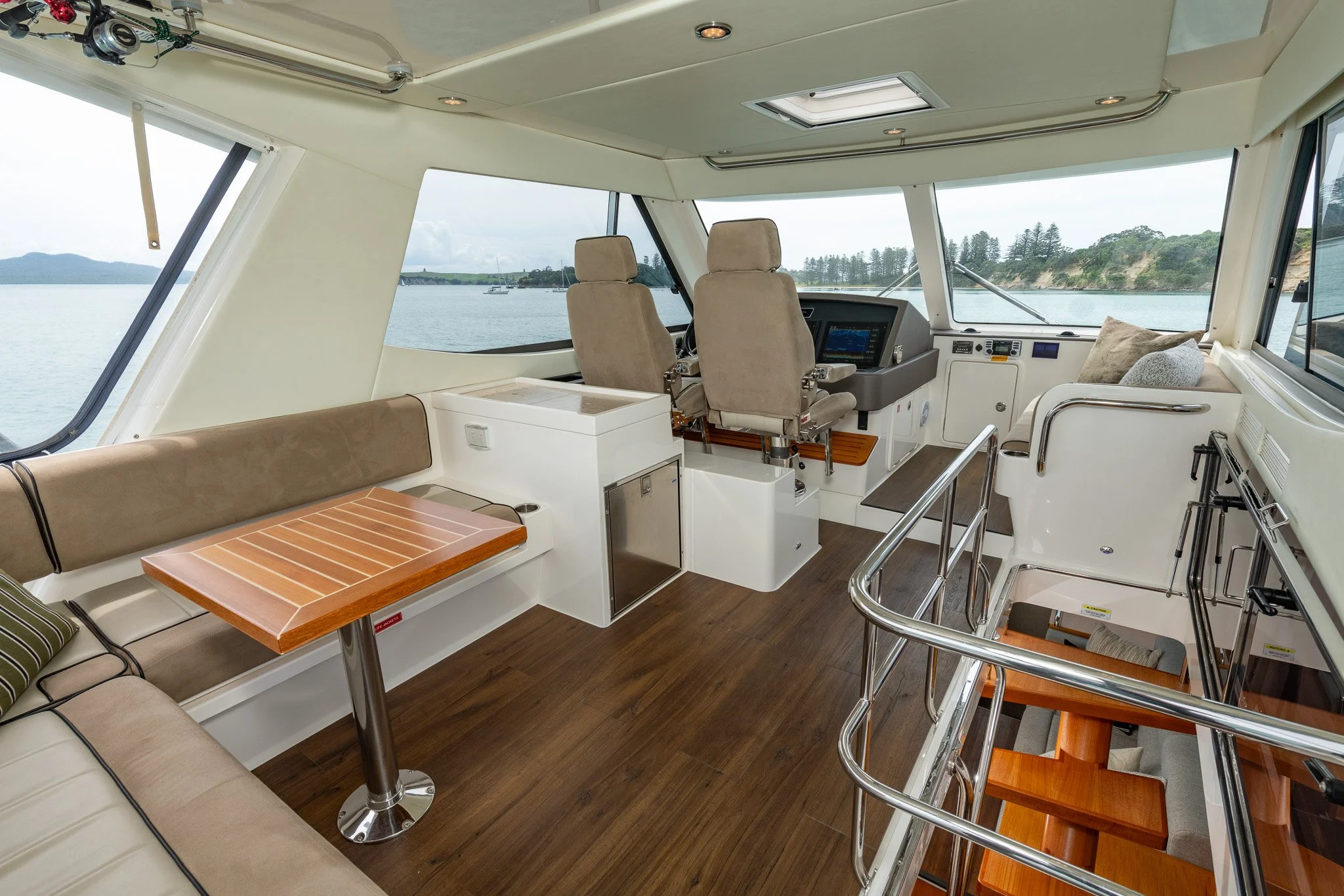 The IPS system ensures confident handling, impressive fuel economy and quiet performance, making her equally suited to experienced owners or family cruising. The enclosed flybridge creates a true second living space with panoramic visibility and a premium helm equipped with Garmin electronics and helm plus four driving station toggles for complete operational control. New flybridge and cockpit upholstery present in excellent condition, while LED mood lighting throughout enhances the atmosphere for evening entertaining. The cockpit is exceptionally well appointed with new refrigeration, generous mezzanine seating and a new rear awning providing additional shade and protection, creating a superb space for relaxing at anchor or hosting guests.