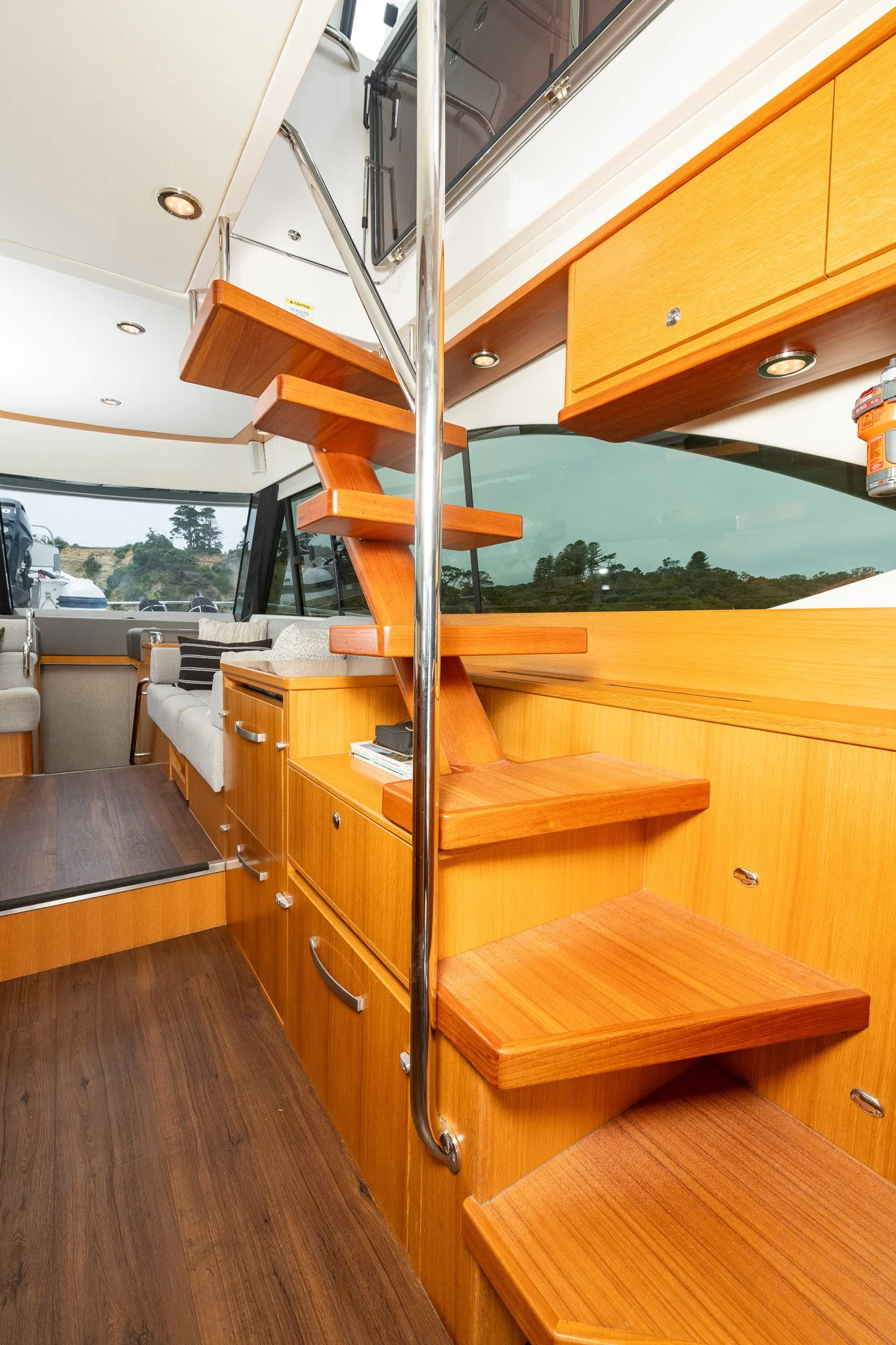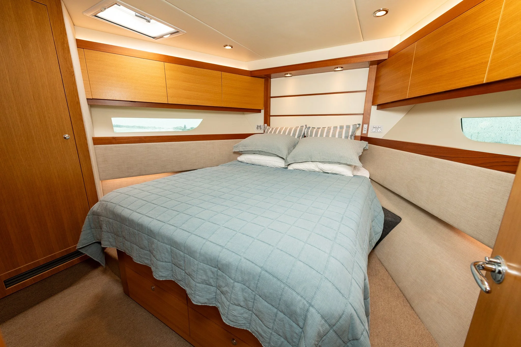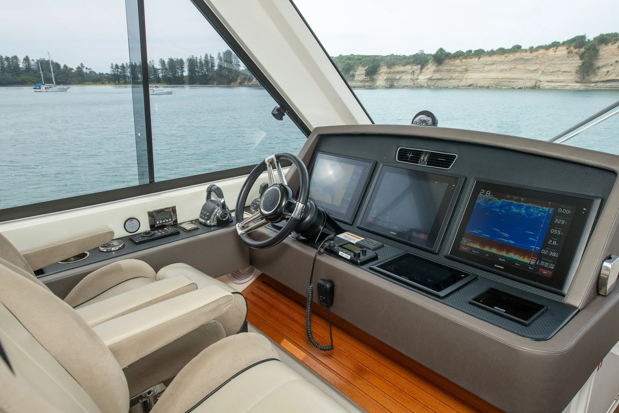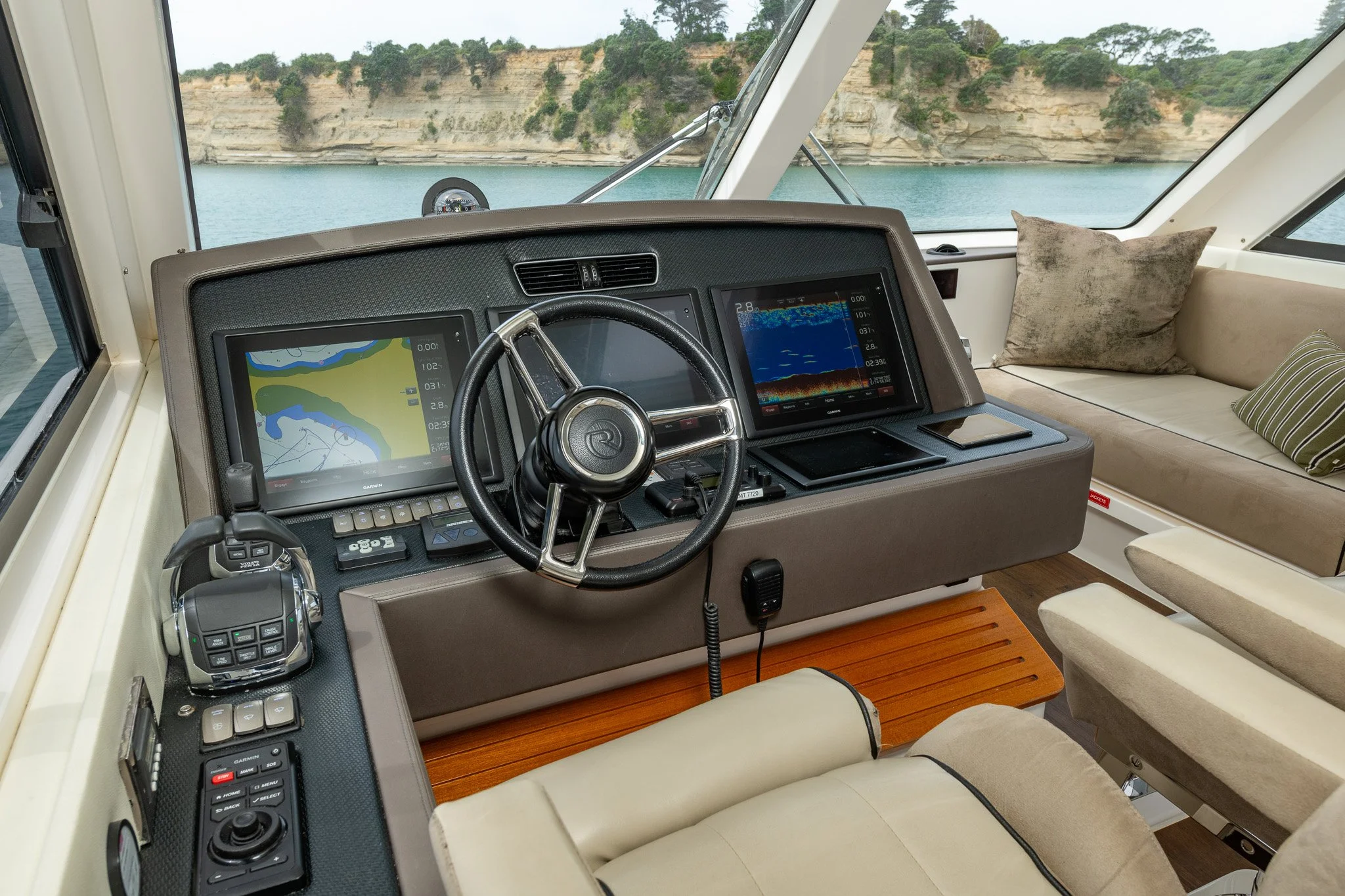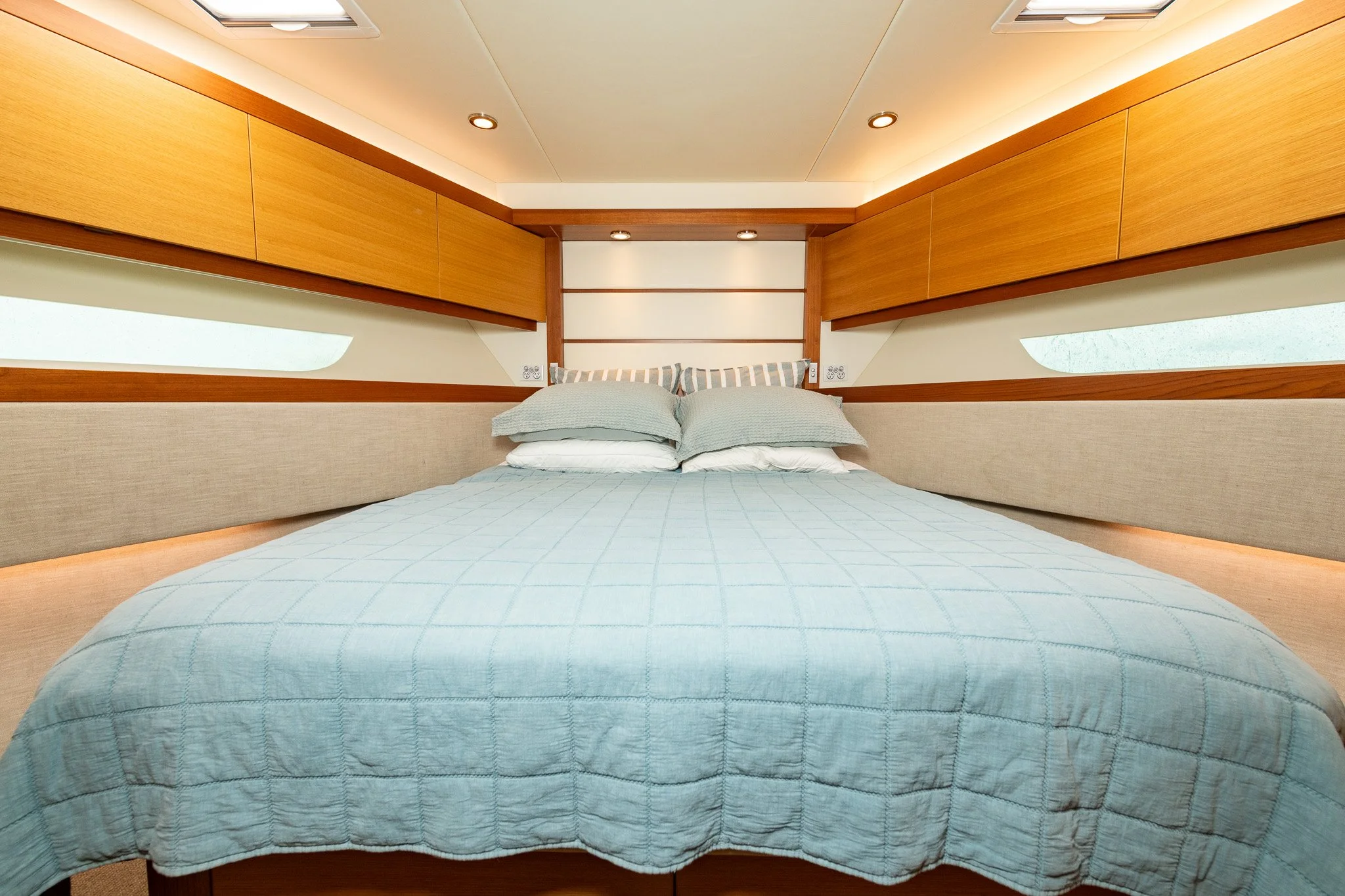 Below deck, the spacious three cabin, two bathroom layout showcases Riviera’s renowned craftsmanship, quality finishes and clever storage solutions, delivering comfort and practicality for extended stays aboard.