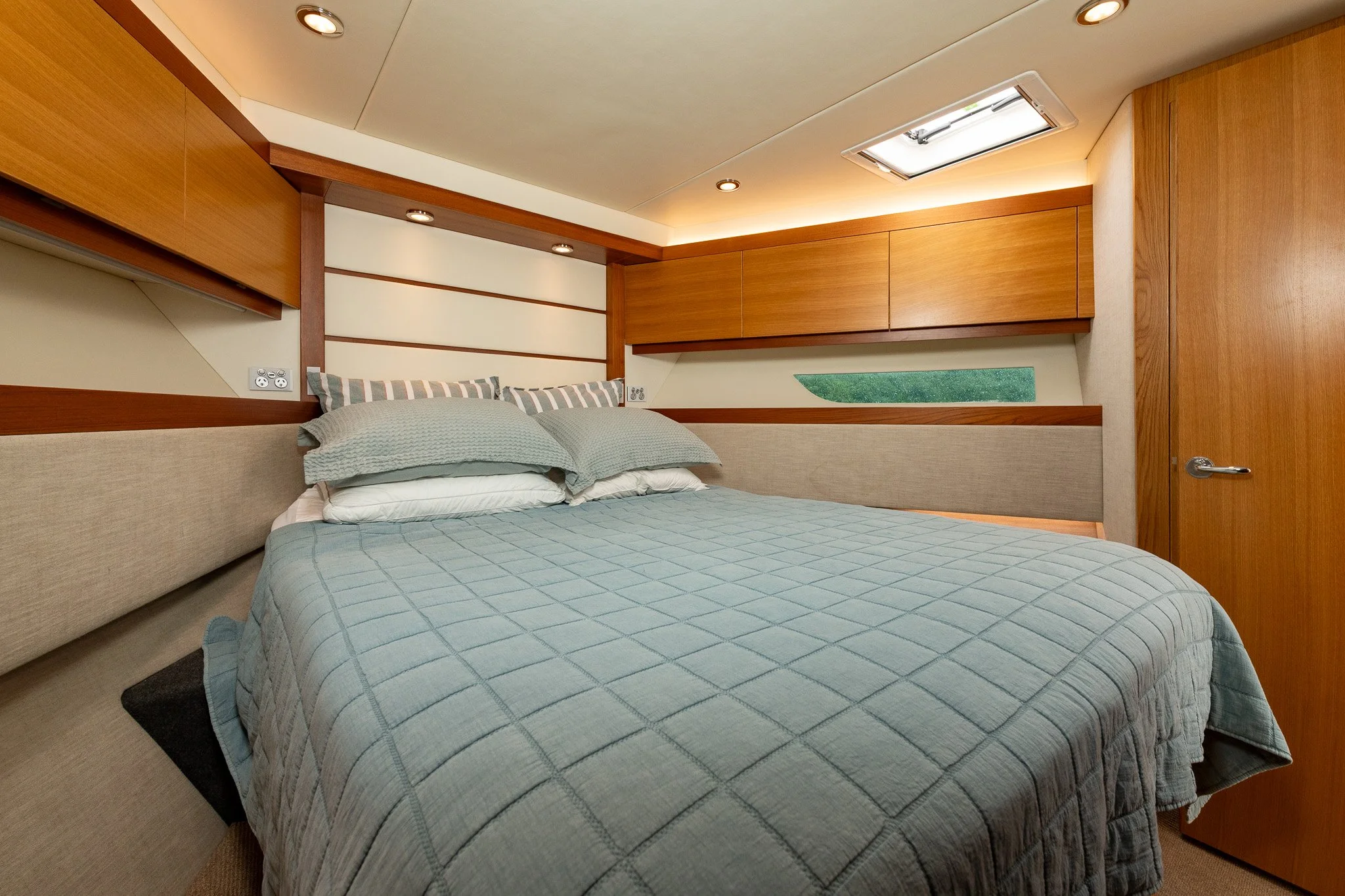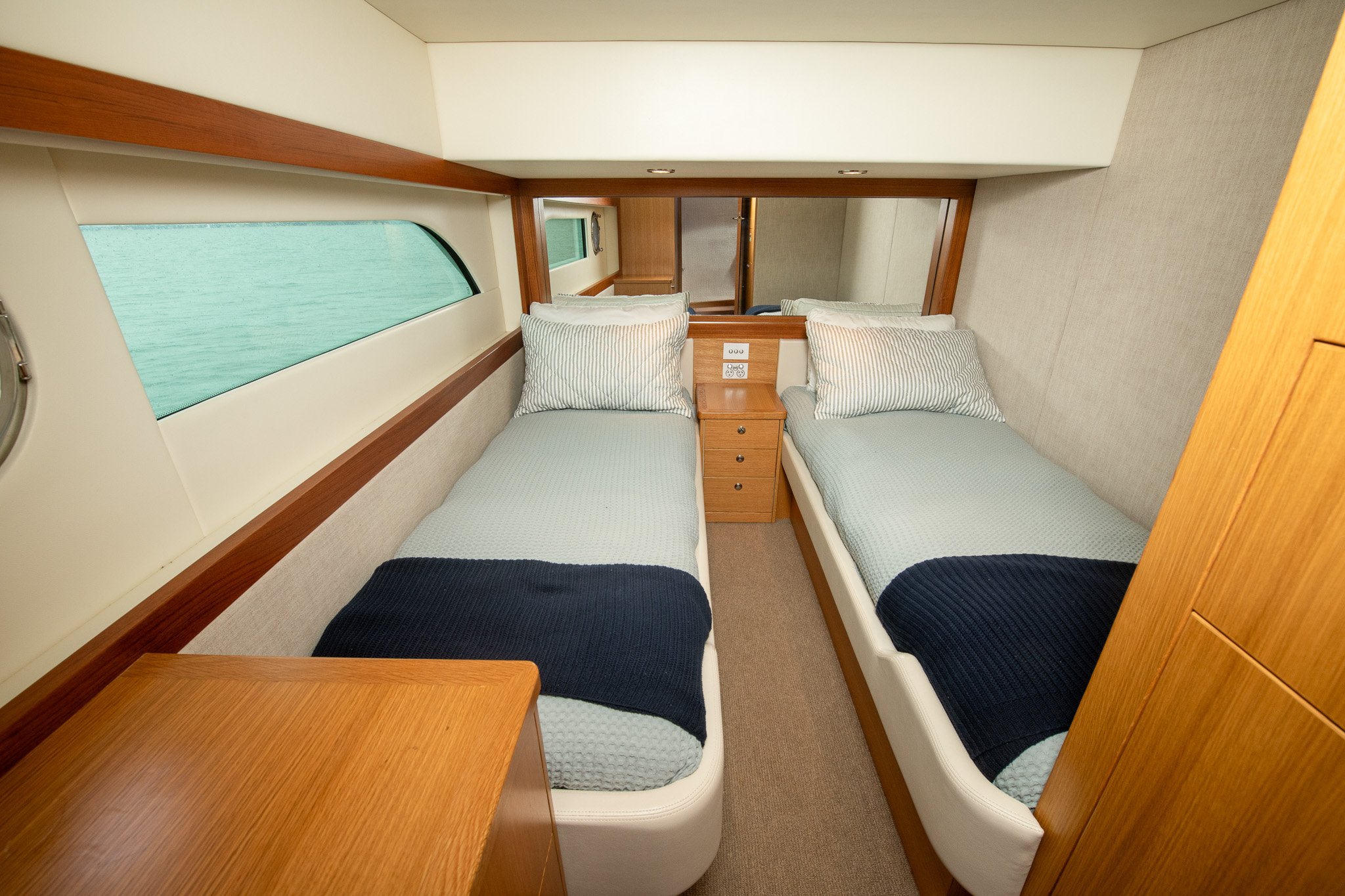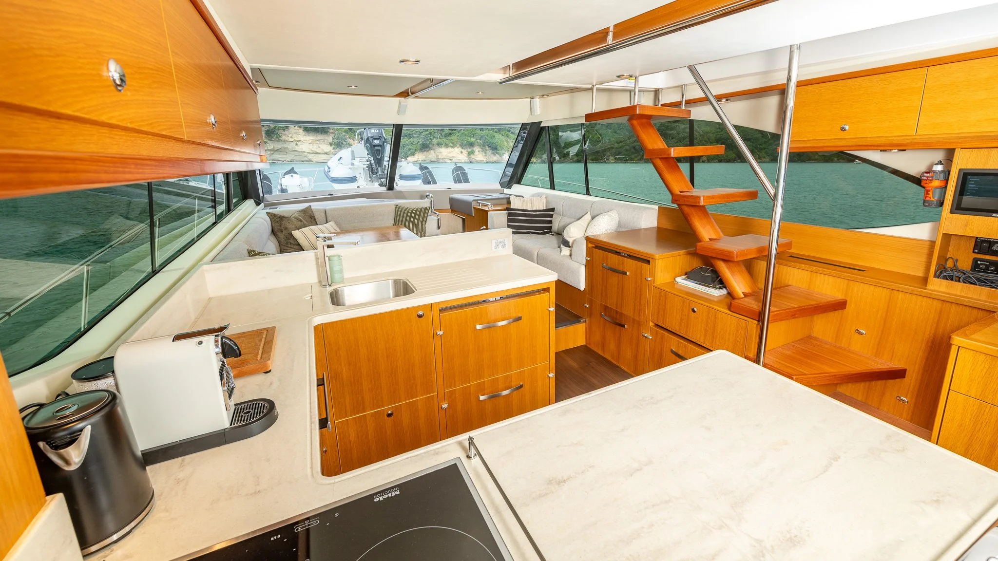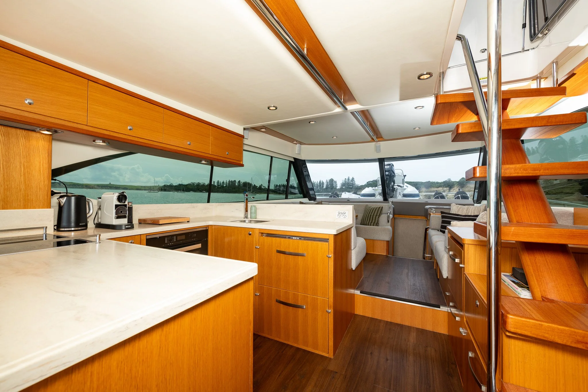 Below deck, the spacious three cabin, two bathroom layout showcases Riviera’s renowned craftsmanship, quality finishes and clever storage solutions, delivering comfort and practicality for extended stays aboard.