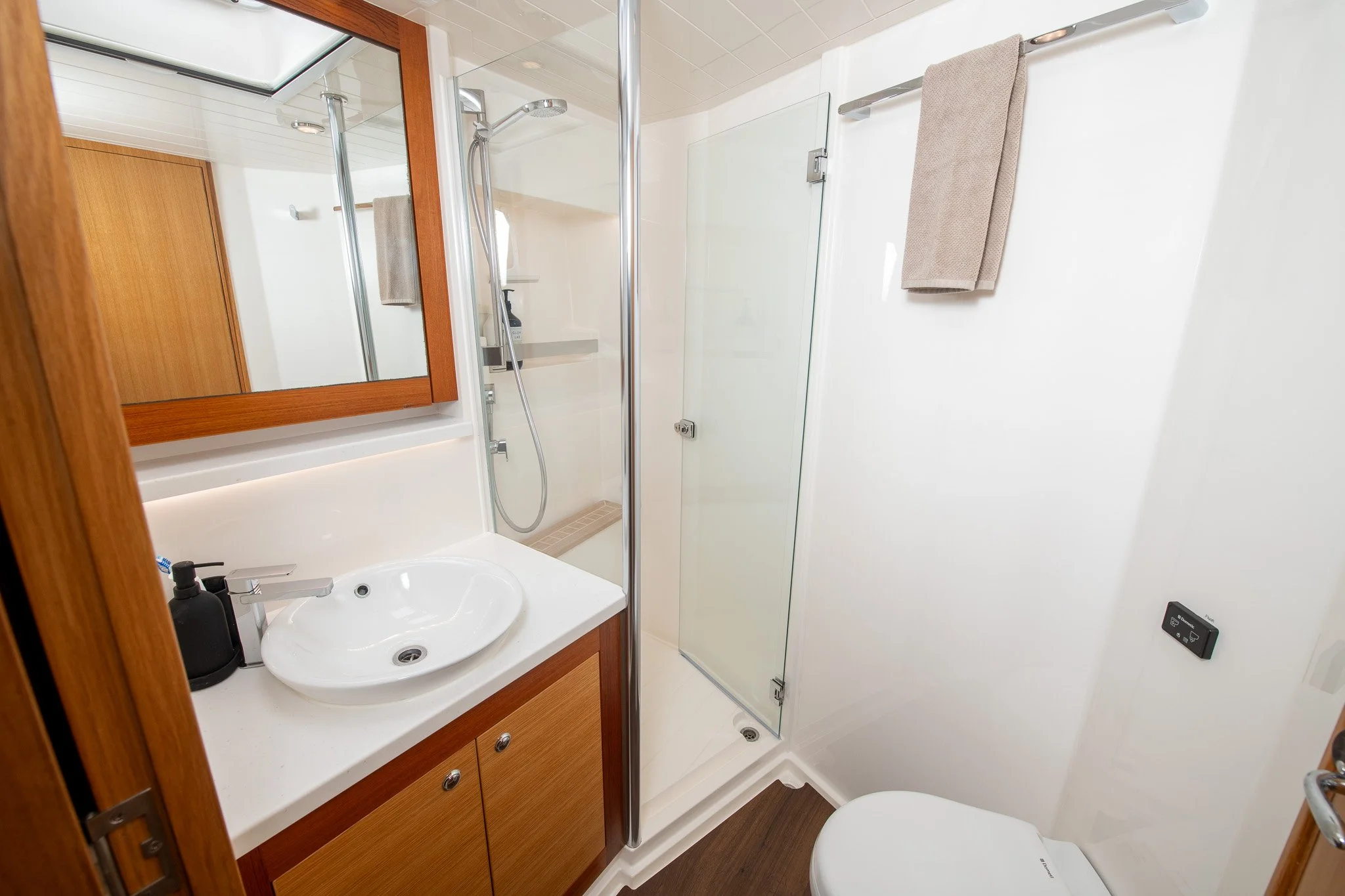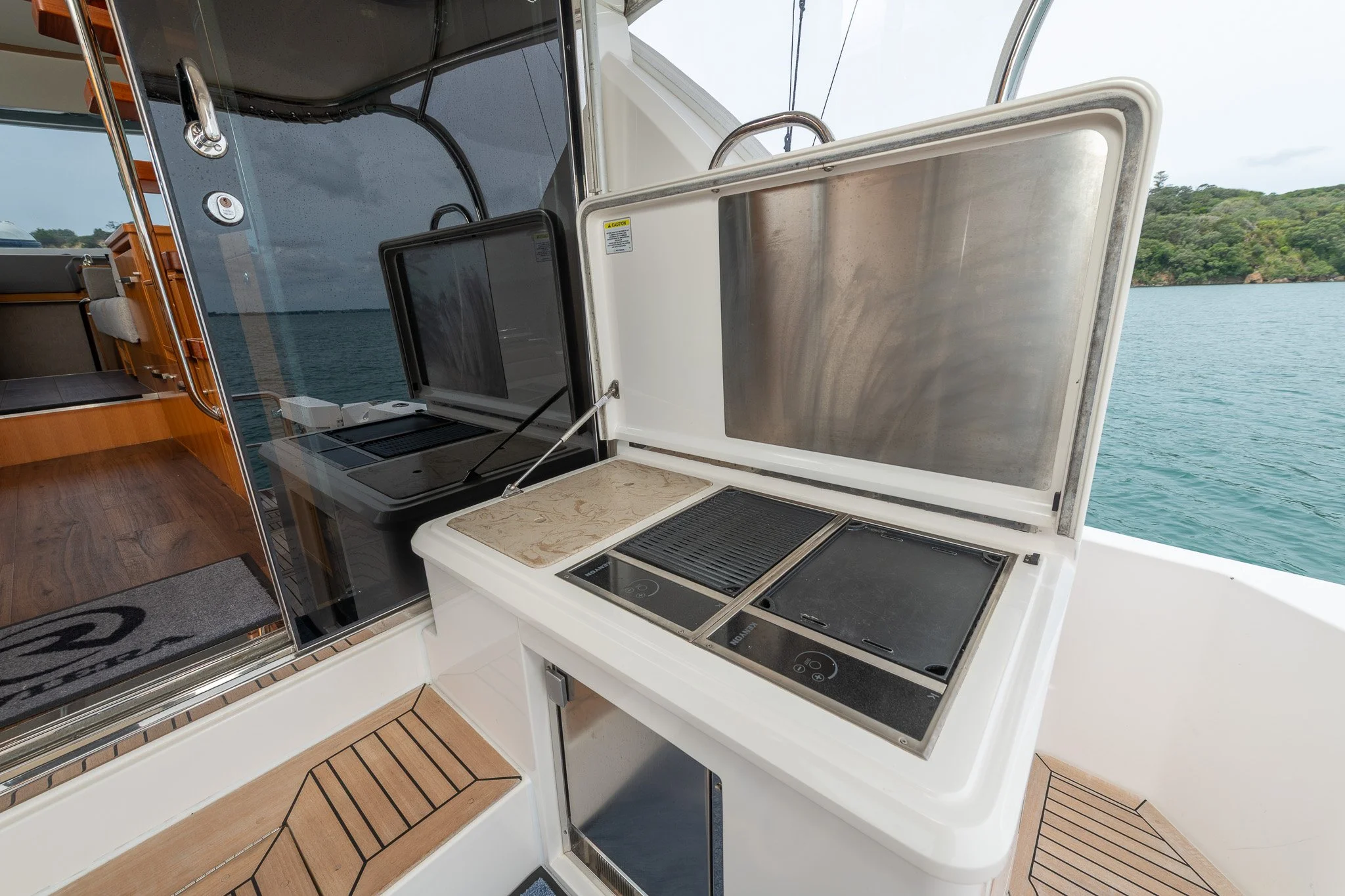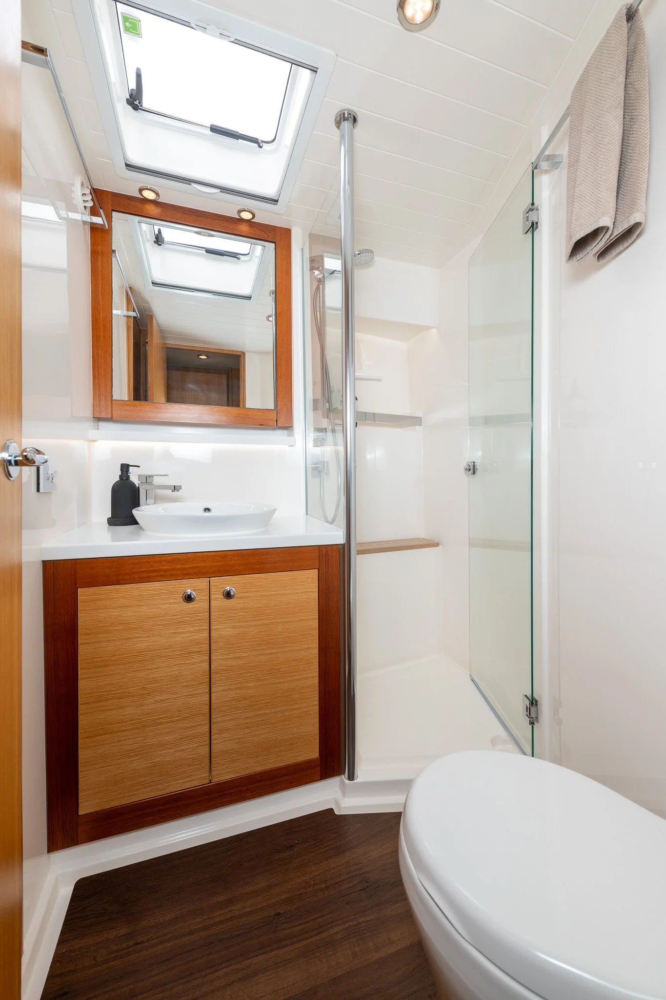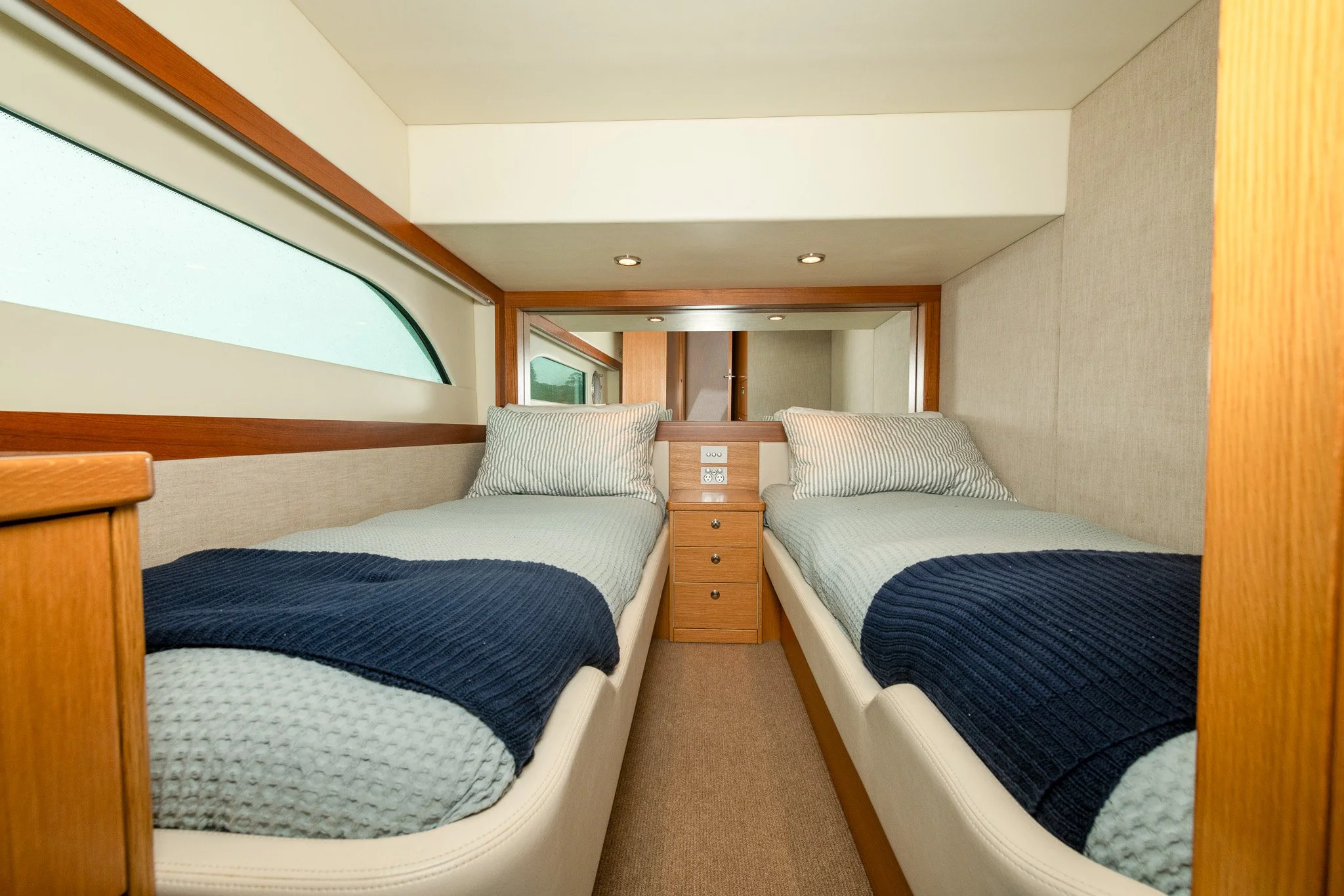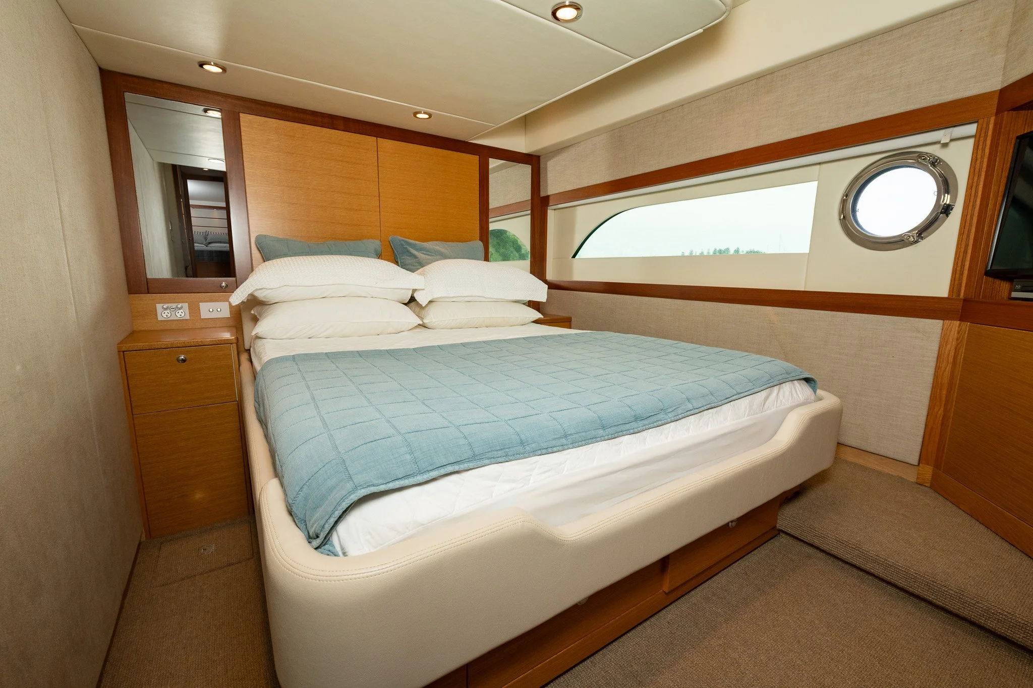 Below deck, the spacious three cabin, two bathroom layout showcases Riviera’s renowned craftsmanship, quality finishes and clever storage solutions, delivering comfort and practicality for extended stays aboard.
