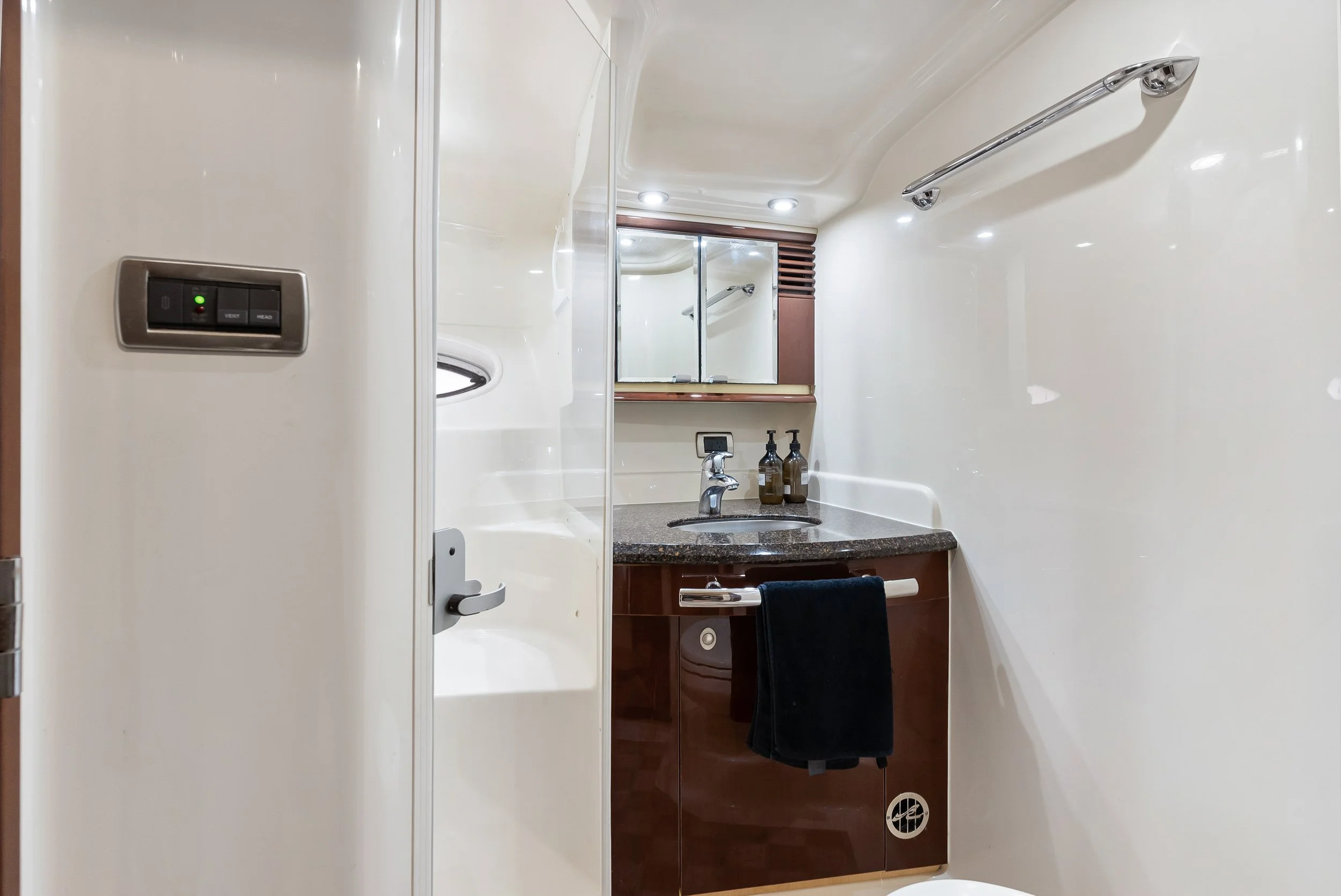 The Sea Ray 52 offers one large stateroom up forward and a double bunk cabin on port boasting exquisite craftsmanship and attention to detail.
