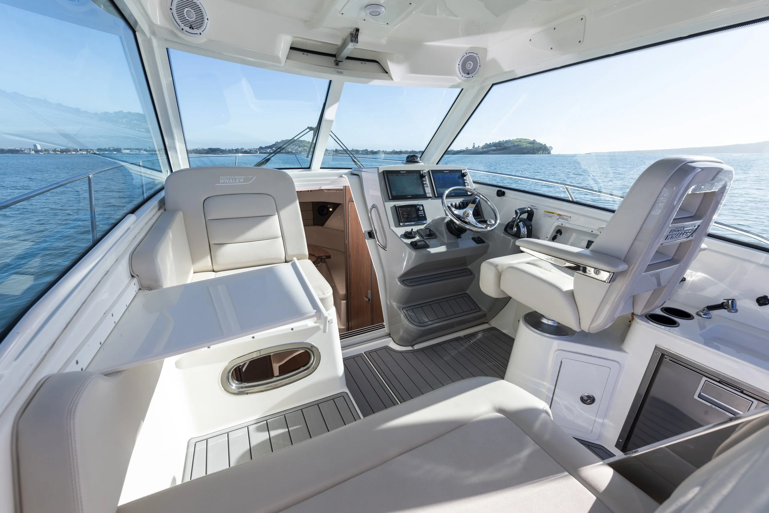 Spacious and stylish control station features ergonomic instrumentation and adjustable helm seat