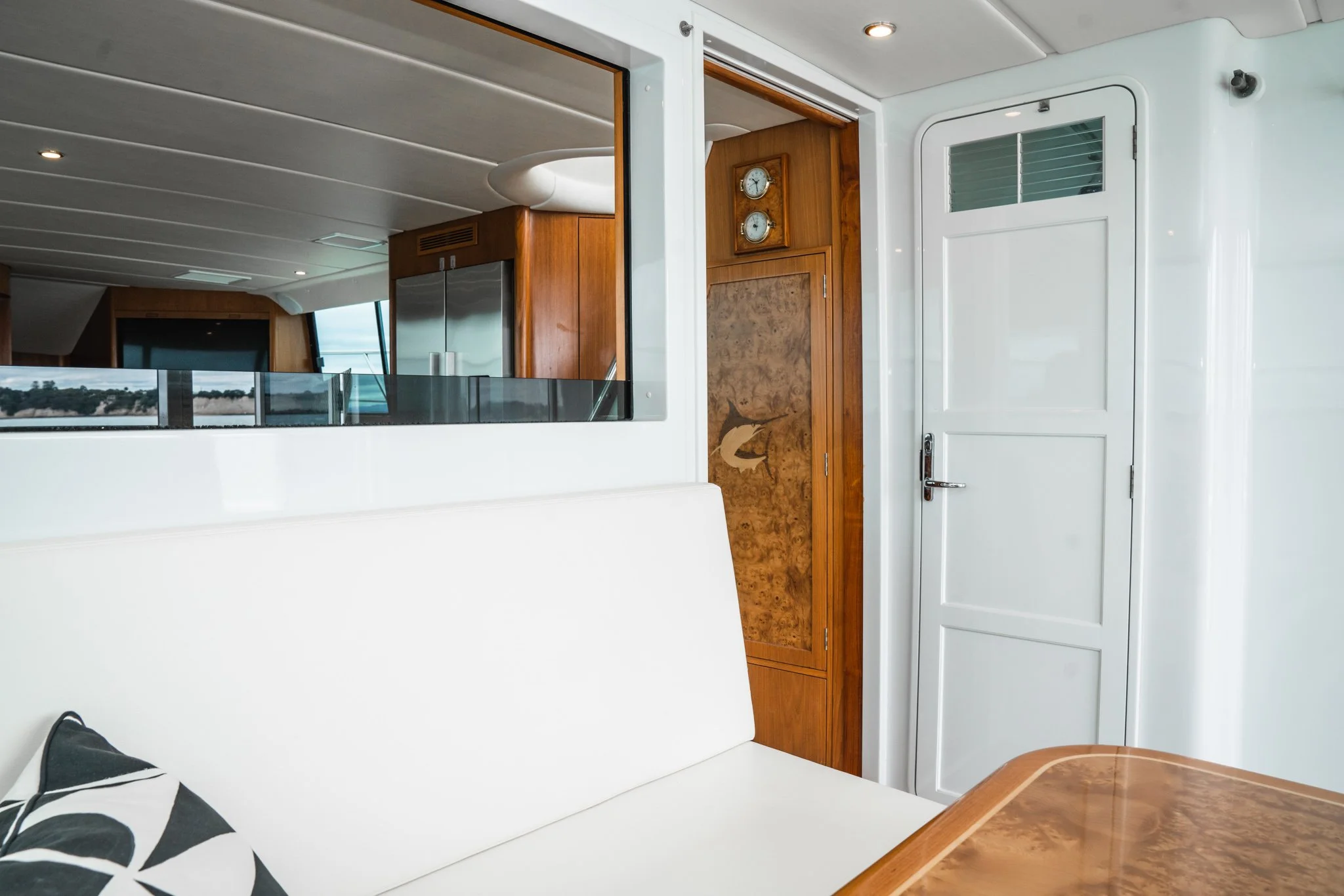 A timeless and superior New Zealand build, I showcase you the Salthouse 63 Sovereign. Offering exceptional sea worthiness and efficiency with her fuel consumption at only 140lph at 1900rpm giving 20 knots. A recent interior refit completed by the interior designer Celine Vernezy in conjunction with skilled craftsmen gives a modern feel while keeping a classic nautical touch. The aft settee leads seamlessly into the galley and saloon with electric windows allowing for alfresco living to all entertaining areas and allowing for them to be separated as required. Internal stairs make accessing the spacious & social flybridge easy with its own fridge and outdoor sun deck with docking/ fishing station. As you head forward to the accommodations leading to the master cabin forward with a queen bed and en suite and two generous guests cabins both with two comfortable singles sleeping a total of 6+